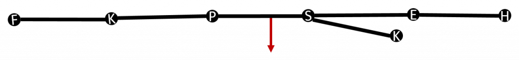 Positionen vor Schritt 1: Fuß (F), Knie (K), Popo (P), Schulter (S), Kopf (K), Ellbogen (E) und Hände (H); das Brustbein beginnt mit der Bewegung nach unten, Popo folgte dem Brustbein (nicht umgekehrt!)
