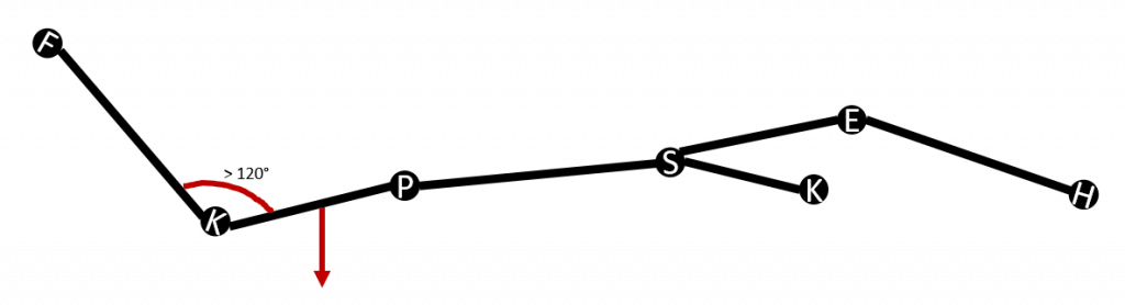 Positionen nach Schritt 3: Fuß (F), Knie (K), Popo (P), Schulter (S), Kopf (K), Ellbogen (E) und Hände (H); die Bewegung ist im Oberschenkel und geht dann bis in die Fußsspitzen weiter